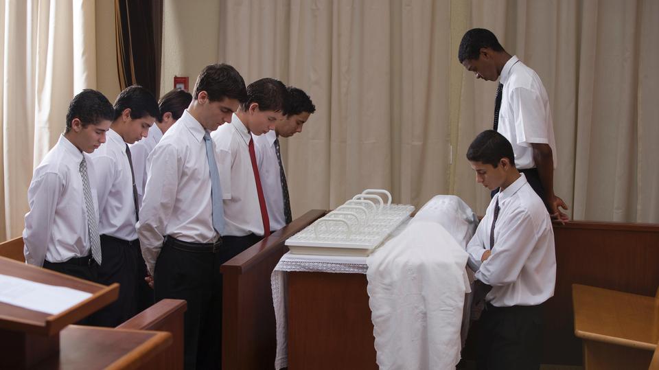 One note to make. Before the service begins, the sacrament is prepared by teachers and priests. This means that the bread trays are laid out with bread, and the water trays are filled. These are covered with a cloth until it’s time for administration.