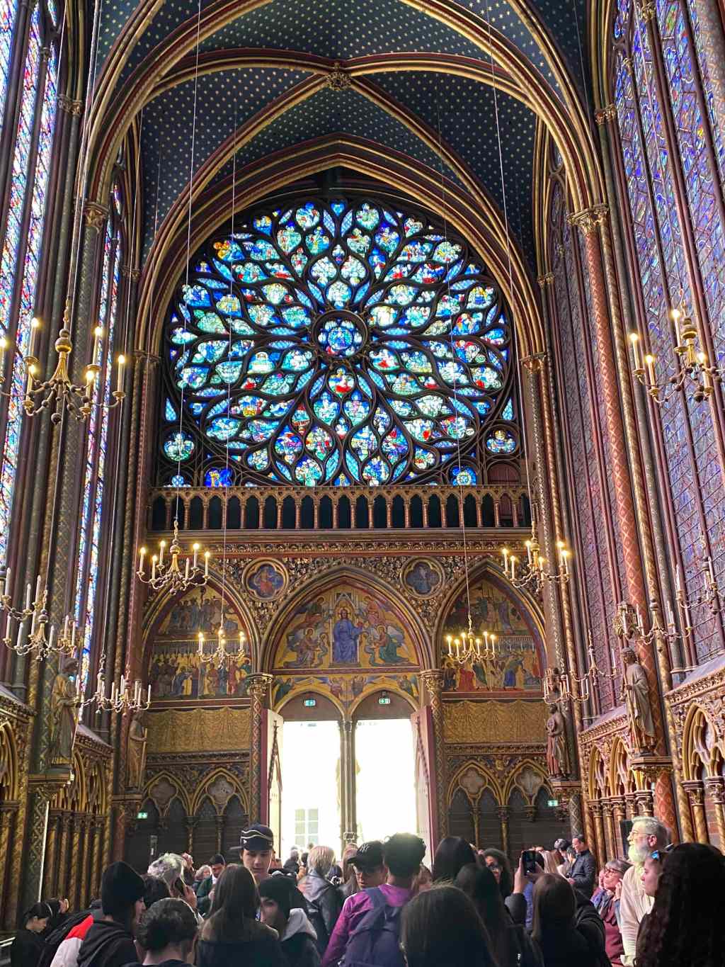 The featured image for this post is “The Rose of the Apocalypse” in the St. Chapelle church in Paris. One of the things that I find inspiring in these churches is the stained glass windows. St. Chapelle’s upper room contains wall-to-wall stained glass. There are squares of glass that depict bible stories. Even though we didn’t attend a service there, the stories in the stained glass helped us remember God’s love.
